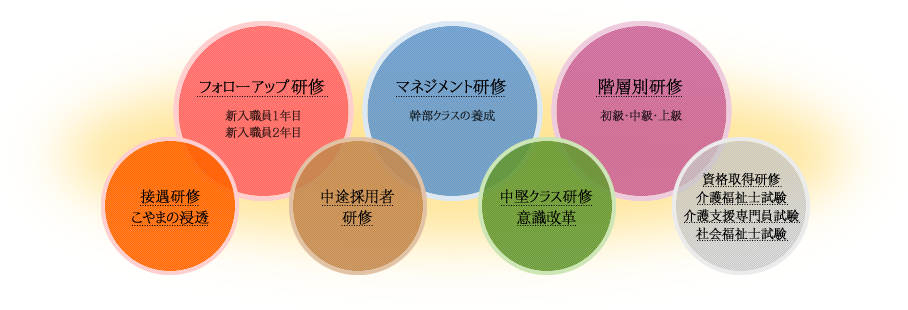 それぞれの法人では毎年、年度目標を立てており、それに基づいたOJTをちゅうしんとした研修を担っています。たとえば、医療法人日翔会並びに社会福祉法人日翔会の平成22年度の年度目標は、「個々の力を集結し、チームの大きな力と変え、こやまケアの浸透をめざす」でした。