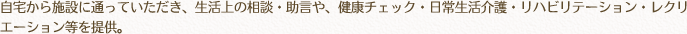 ご希望により、食事・入浴・送迎のサービスを受けることができます。 (対象者:要支援1~2、要介護1~5)